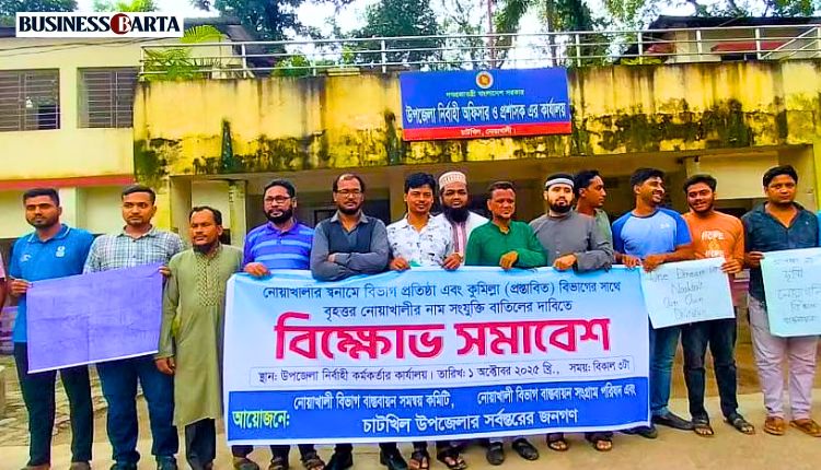 নোয়াখালীকে স্বতন্ত্র প্রশাসনিক বিভাগ ঘোষণার দাবিতে সোনাইমুড়ী ও চাটখিলে বিক্ষোভ ও মানববন্ধন অনুষ্ঠিত হয়েছে। বৃহস্পতিবার (২ অক্টোবর) বেলা সাড়ে ১১টা ও বিকেল ৫টার দিকে পৃথক কর্মসূচি পালিত হয়। সোনাইমুড়ী চৌরাস্তায় ব্লকেডের কারণে নোয়াখালী–কুমিল্লা ও চৌমুহনী–রামগঞ্জ সড়কে দীর্ঘ যানজটের সৃষ্টি হয়। এক ঘণ্টা স্থায়ী ব্লকেডের ফলে ওই সময়ে সব ধরনের যান চলাচল বন্ধ ছিল।