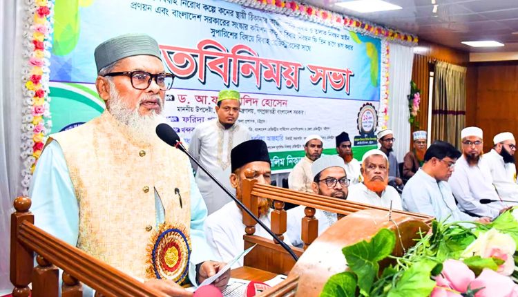 ধর্ম উপদেষ্টা ড. আ ফ ম খালিদ হোসেন বলেছেন, যৌতুক বন্ধে ইমাম-খতিবদের দায়িত্বশীল ভূমিকা রাখতে হবে। বিভিন্ন ফোরামে ইমাম-খতিবদের কথা বলার যে সুযোগ রয়েছে সেটা কাজে লাগাতে হবে।শনিবার ( ১২ এপ্রিল ) সকালে চট্টগ্রামের এলজিইডি ভবনের কামরুল ইসলাম সিদ্দিক মিলনায়তনে মুসলিম নিকাহ রেজিস্ট্রারদের সাথে মতবিনিময় সভায় তিনি এসব কথা বলেন।